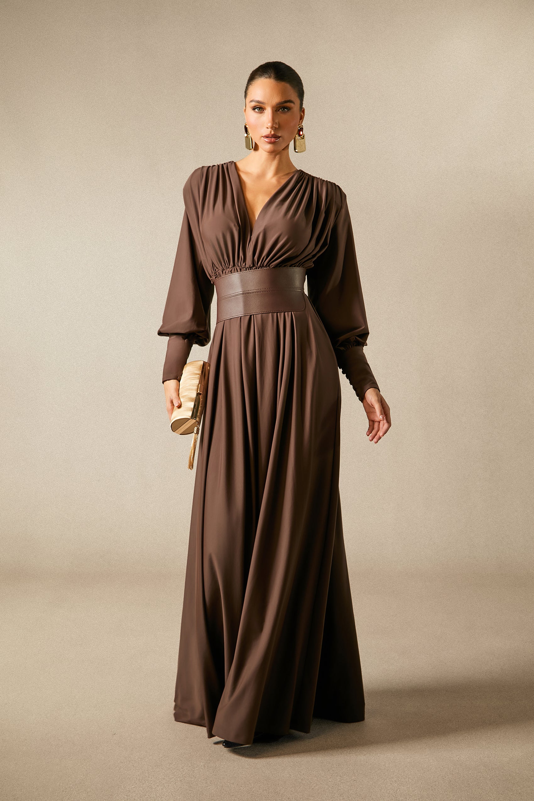 فستان ماكسي أنيق بأكمام طويلة وفتحة صدر عميقة