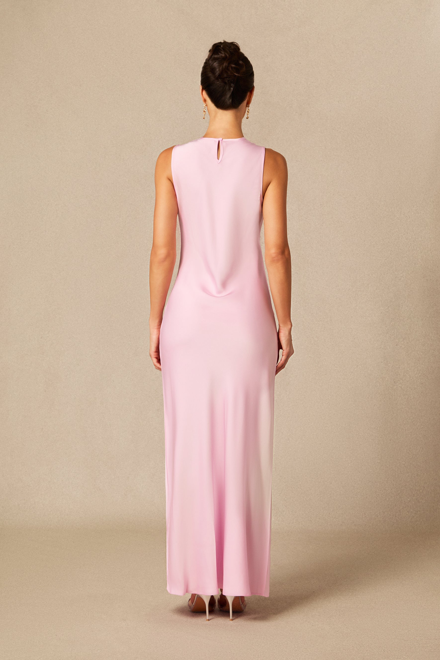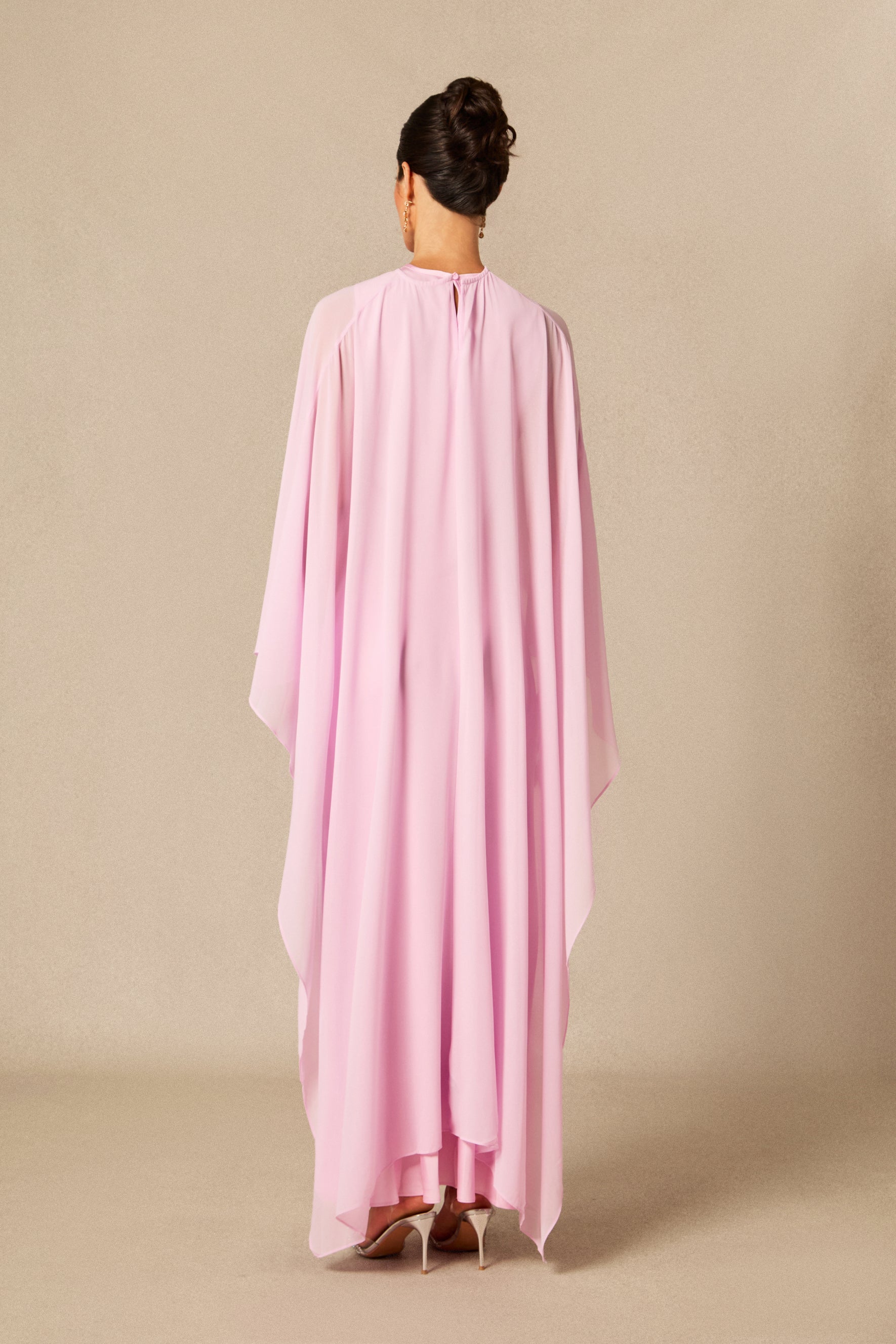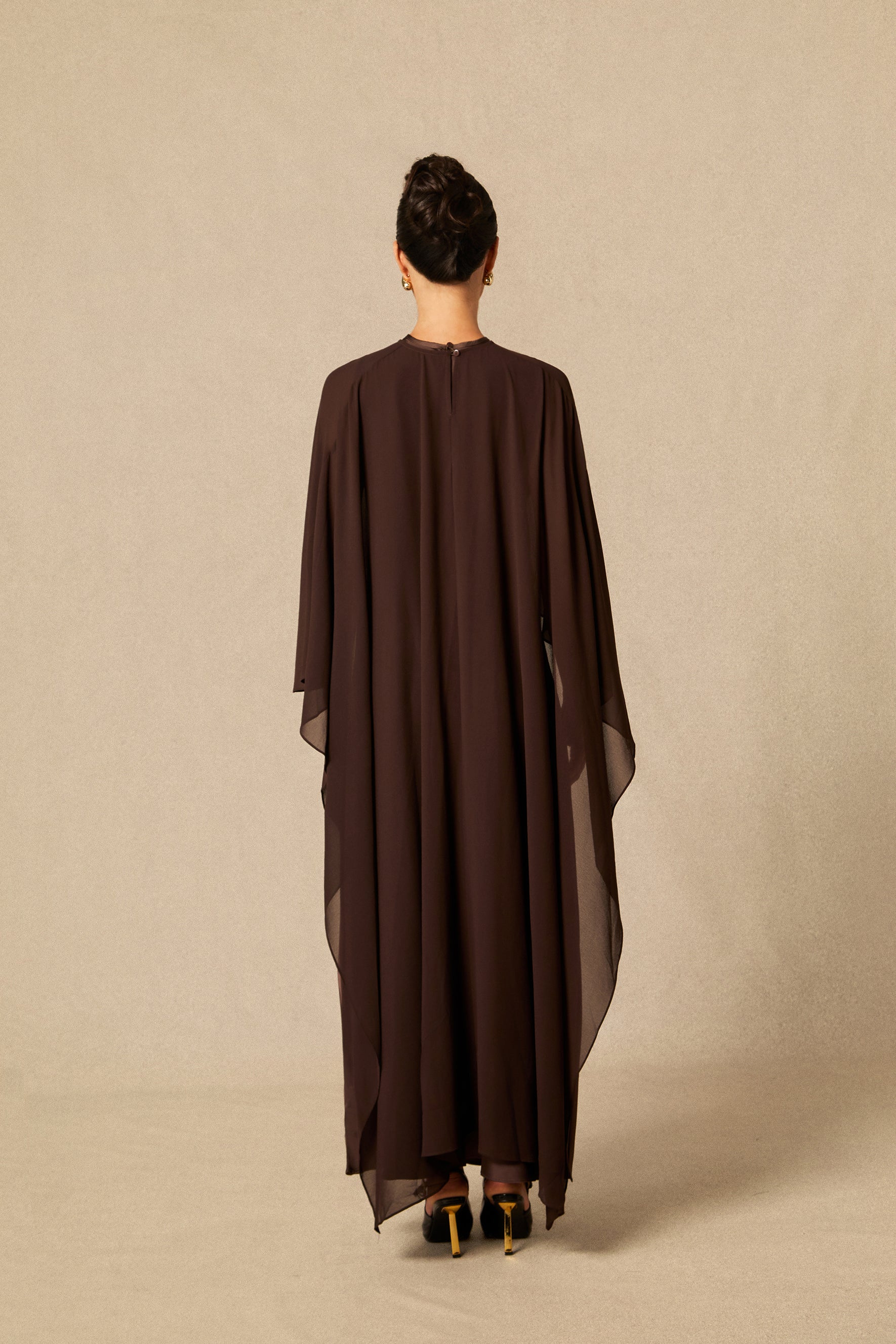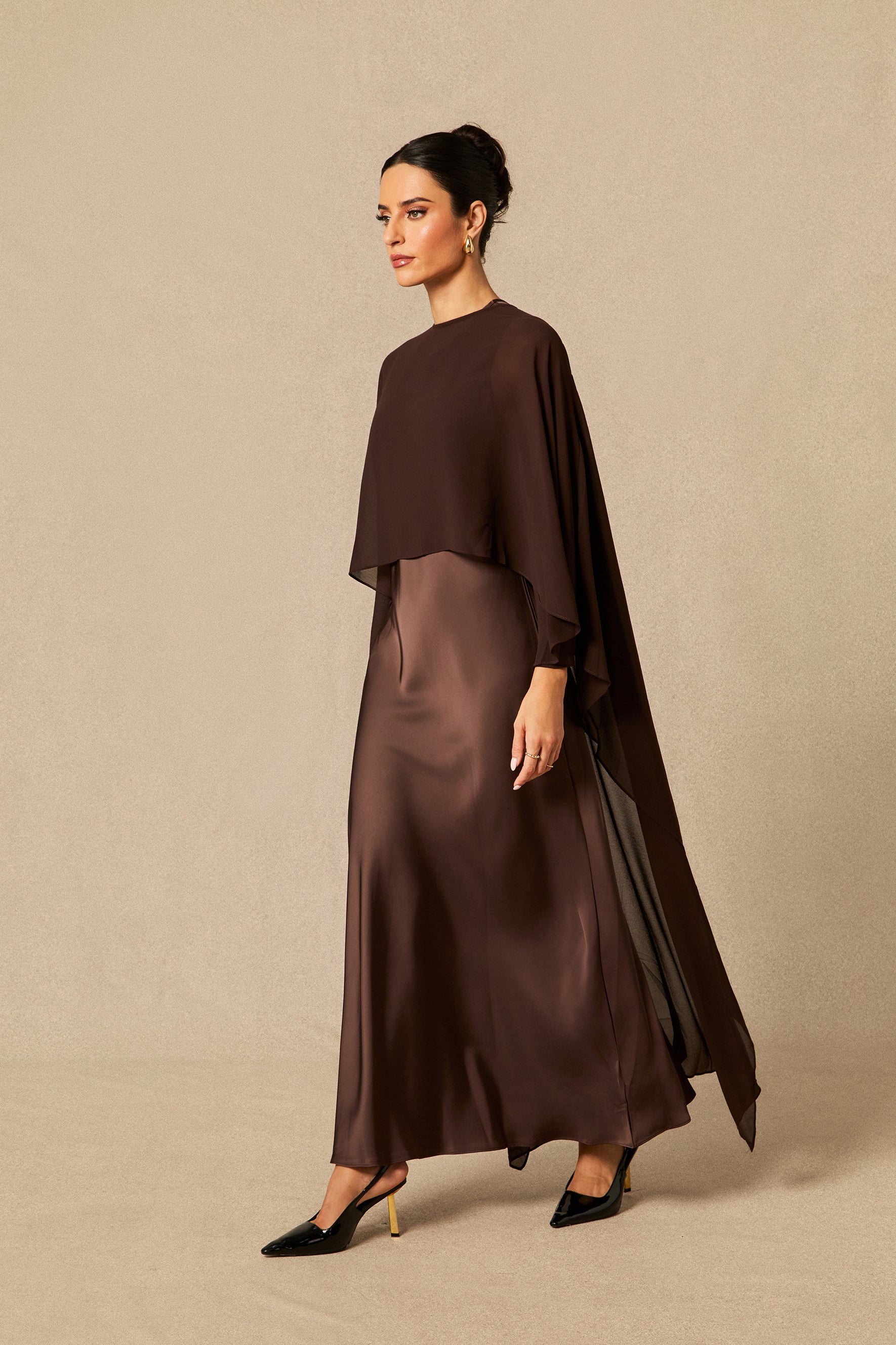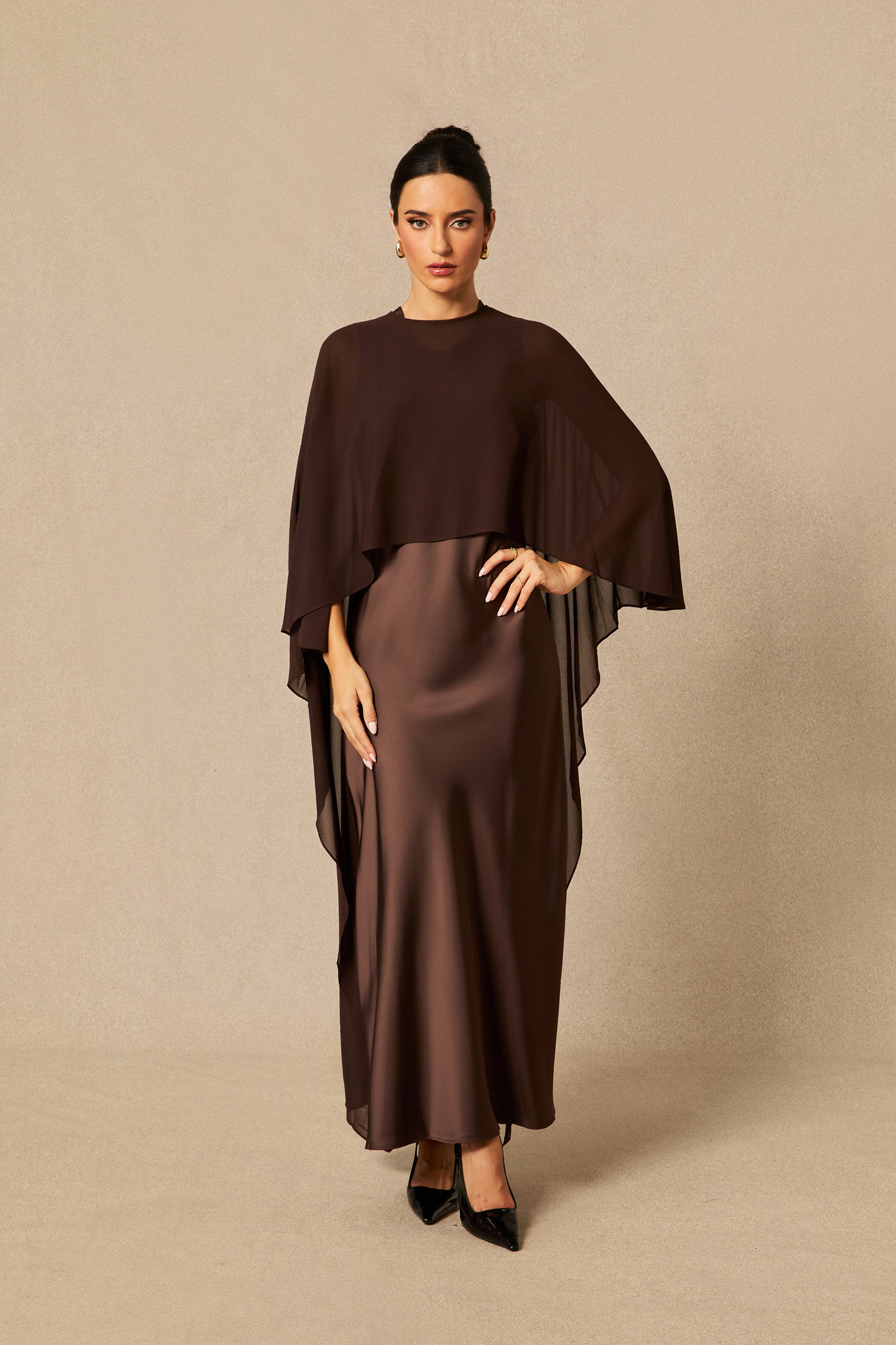 اكتشفي سحر الأناقة مع هذا الفستان الماكسي الأنيق بدون أكمام، والذي يتميز بتصميم كاب منسدل رائع. مصمم خصيصاً لمن يُقدّرن الأناقة الراقية بلمسة عصرية.