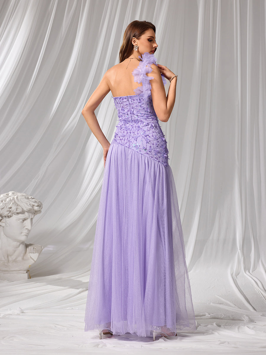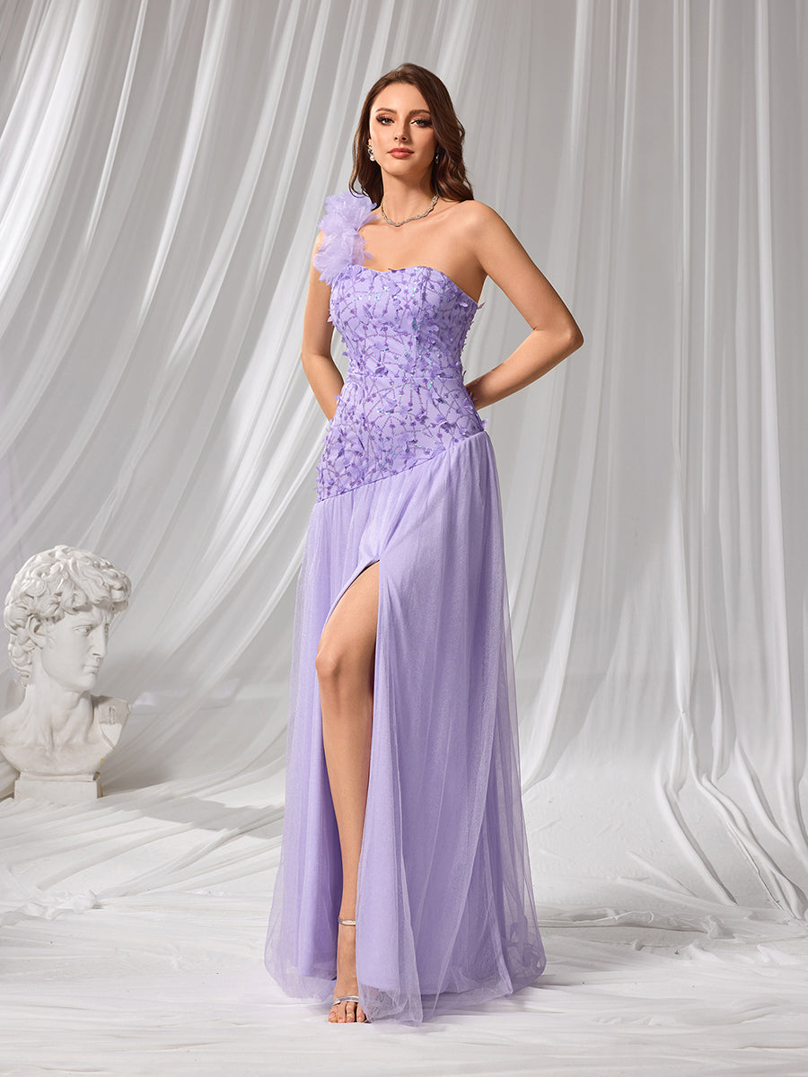 يتميز فستان السهرة الأنيق هذا بلونه الخزامي، وصدريته المطرزة بدون حمالات مع لمسة رومانسية من التول على كتف واحد. أما تنورته الشفافة المتدفقة وفتحة صدره العالية فتضفي عليه لمسة من الفخامة، مما يجعله مثالياً لحفلات الزفاف، والمناسبات الرسمية في الحدائق، والسهرات المسائية.