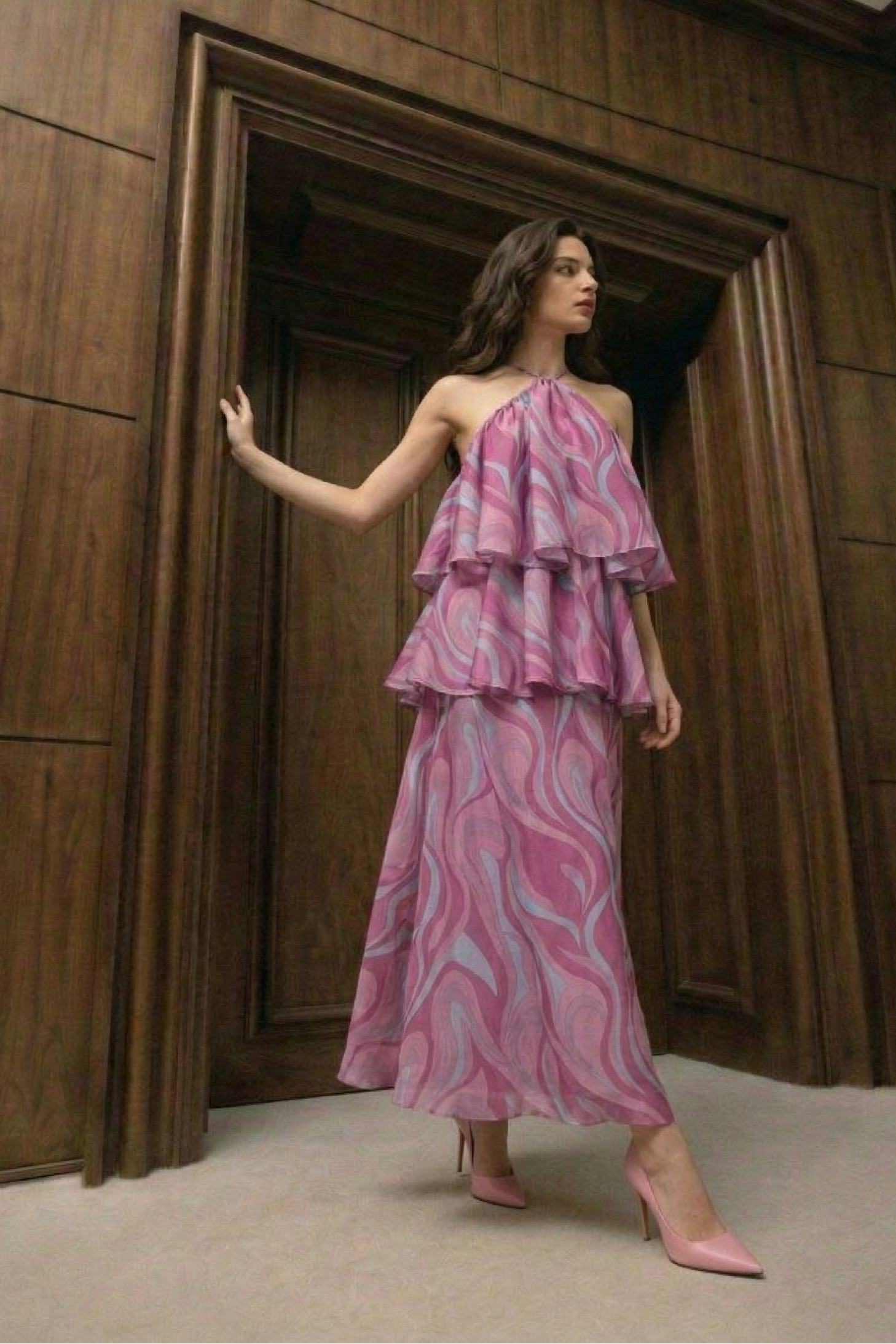يتميز هذا الفستان الأنيق برقبة هالتر وتصميم مستوحى من الطراز الكلاسيكي مع نسيج متموج وتفاصيل كشكش متعددة الطبقات، مما يخلق مظهراً أنيقاً وراقياً. مثالي للمناسبات الرسمية، هذا التنورة الطويلة المستقيمة تقدم أسلوباً خالداً يجمع بين الرقي والعملية.