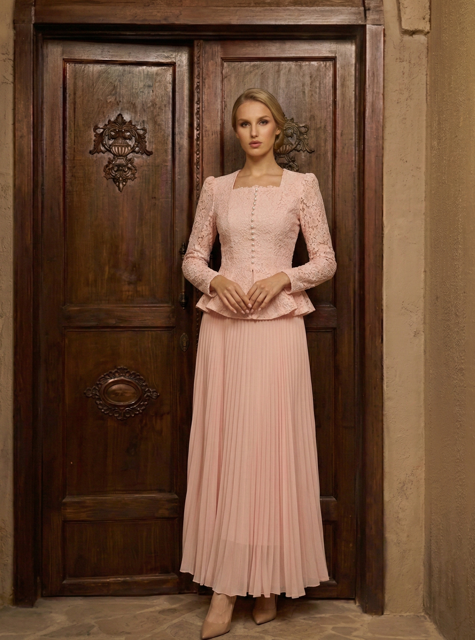 استمتعي بالأناقة والرقي مع هذا الطقم الرائع المكون من جاكيت دانتيل وردي وتنورة مطوية، مثالي لأي مناسبة خاصة أو حدث رسمي. يضيف الدانتيل المطرز بدقة وأزرار اللؤلؤ لمسة من السحر والرقي، مما يضمن لكِ التميز بأناقة راقية.
