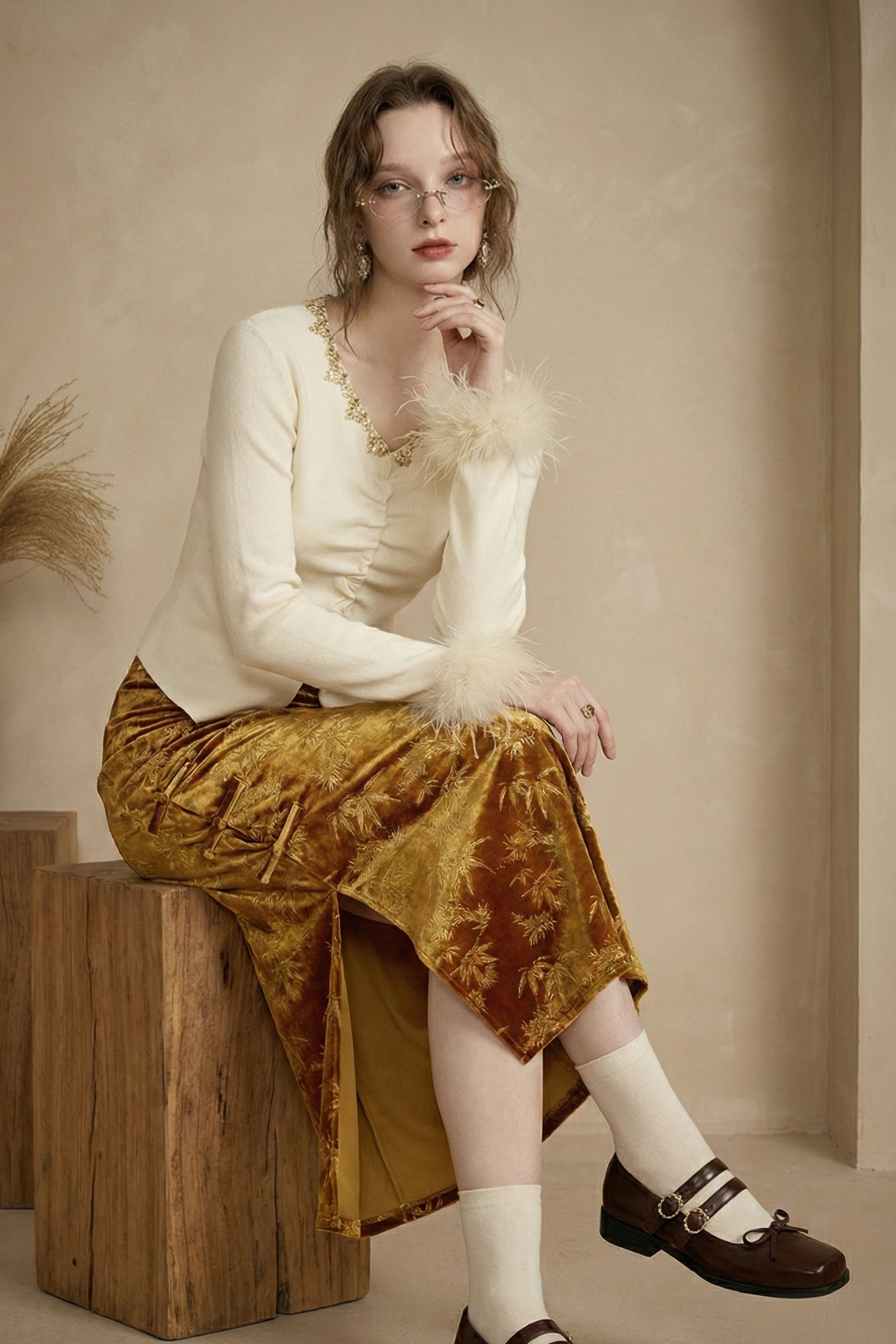 تتميز هذه الكنزة الأنيقة بتطريزات خرزية ثقيلة دقيقة وياقة على شكل V تضفي لمسة من الرقي على خزانة ملابسك الخريفية. التصميم المجعد والقصّة الضيقة يجعلها طبقة أساسية مثالية لأي إطلالة أنيقة.