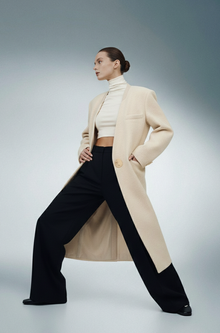 هذا المعطف الصوفي الأنيق هو إضافة خالدة لأي خزانة ملابس، يتميز بتصميم بدون ياقة وإغلاق بزر واحد لمظهر أنيق وبسيط. مثالي لمناسبات الشتاء، يوفر هذا المعطف الطويل الدفء والأناقة، مما يجعله قطعة أساسية للتنسيق الراقي.