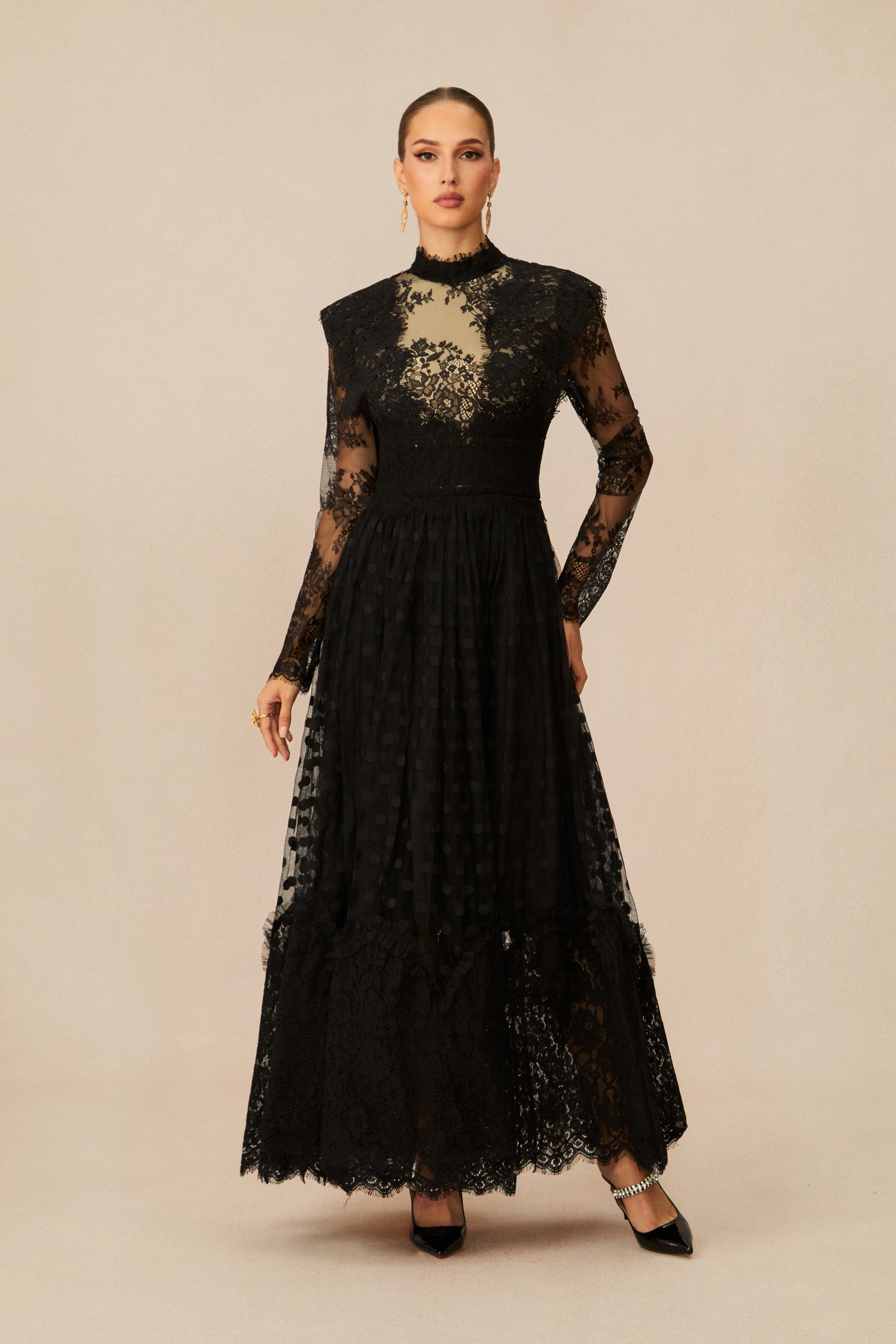 فستان ماكسي من الدانتيل الأسود المصقول بنقاط البولكا