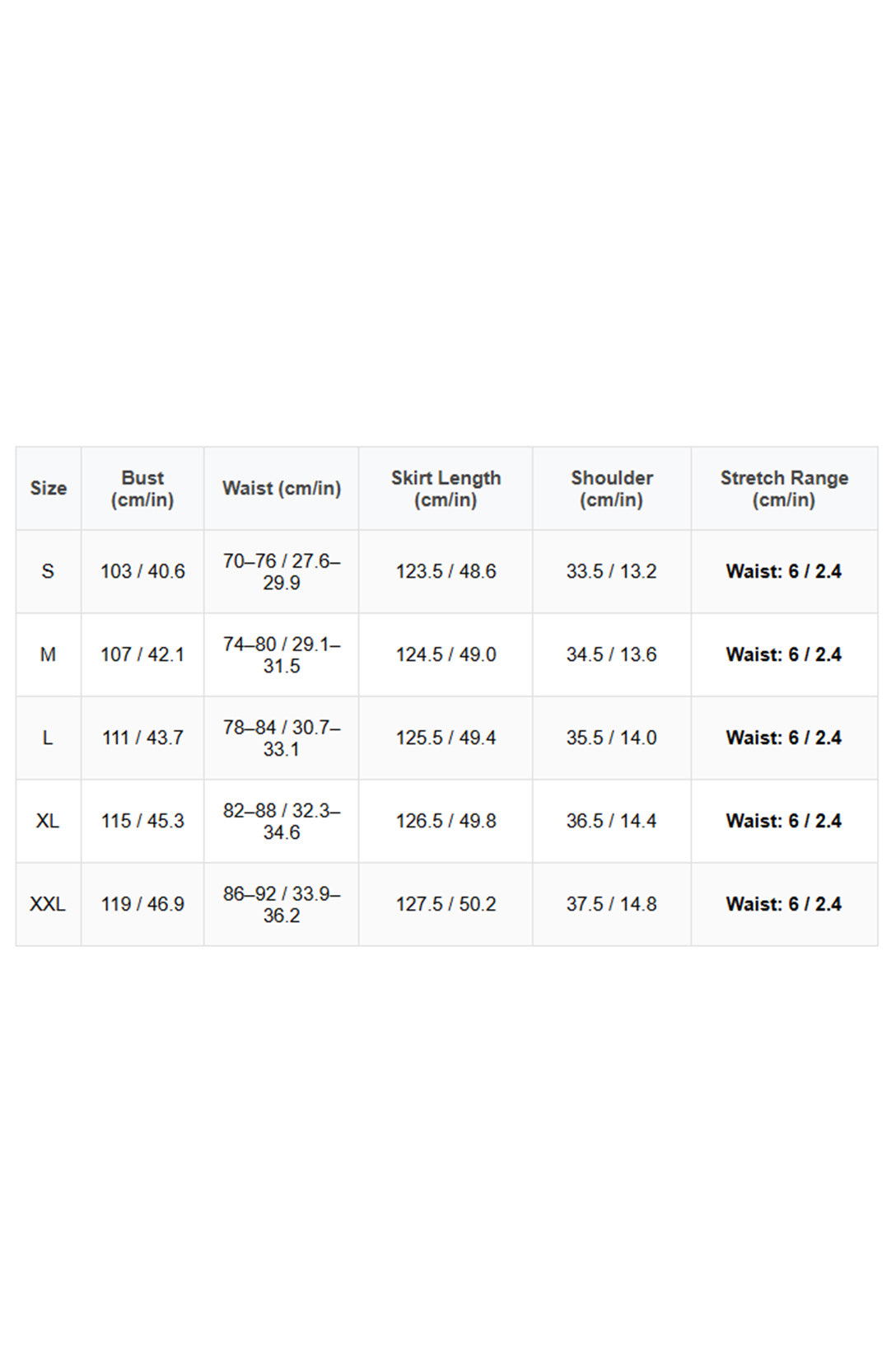 | مقاس | محيط الصدر (سم/بوصة) | محيط الخصر (سم/بوصة) | طول التنورة (سم/بوصة) | الكتف (سم/بوصة) | نطاق التمدد (سم/بوصة) |