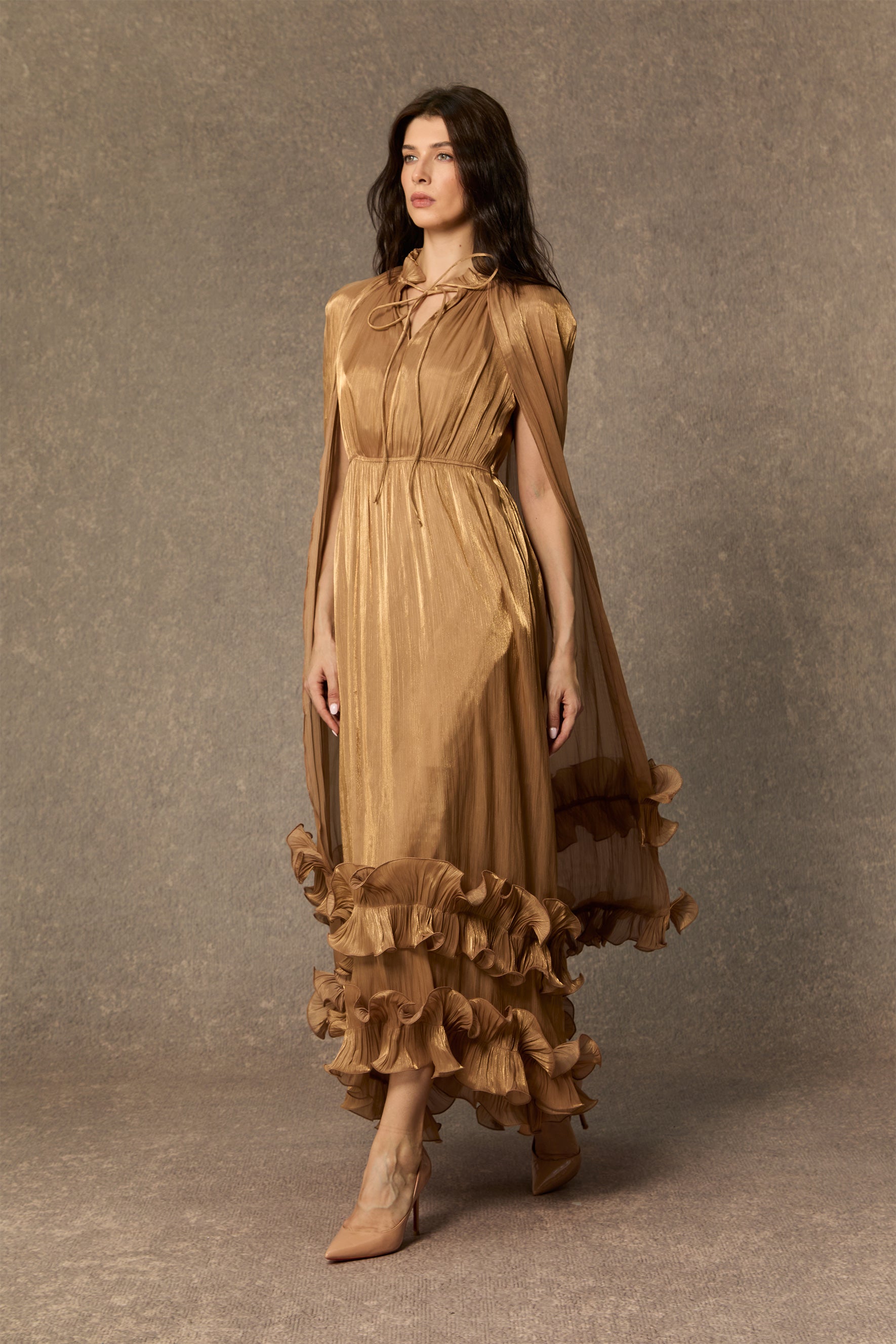 - التصميم: فستان أنيق متوسط الطول بحافة مكشكشة أنيقة، وربطة عنق، وتصميم بدون أكمام بألوان ترابية.