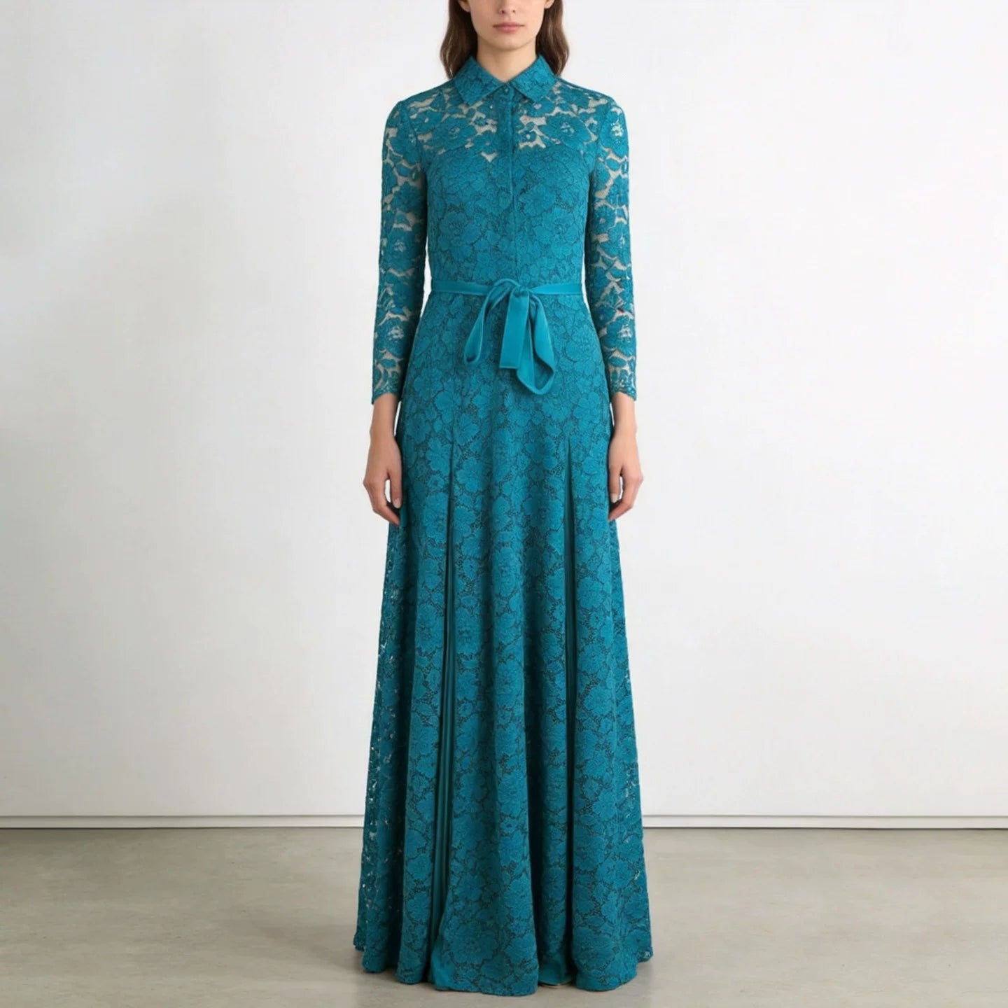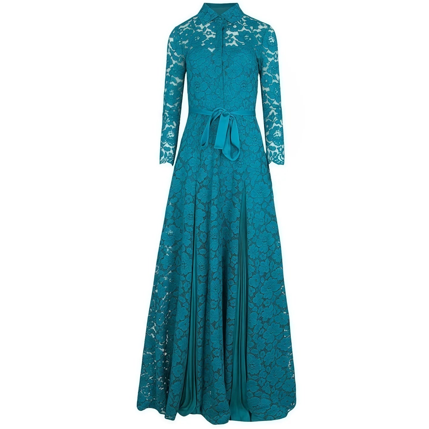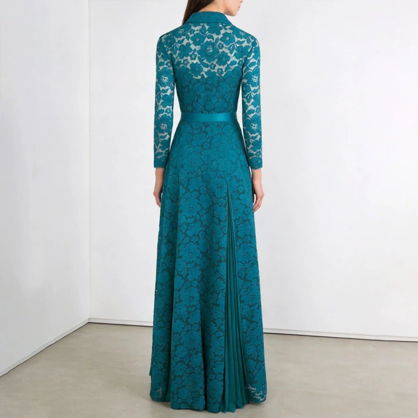 ارتقِ بخزانتك مع هذا الفستان الدانتيل الأنيق، الذي يتميز بتصميم قطعتين وهمي بلون أزرق بحري رائع. مثالي للمناسبات الخاصة، يجمع هذا الفستان بين تنورة مطوية ورباط خصر لإطلالة أنيقة وجذابة.