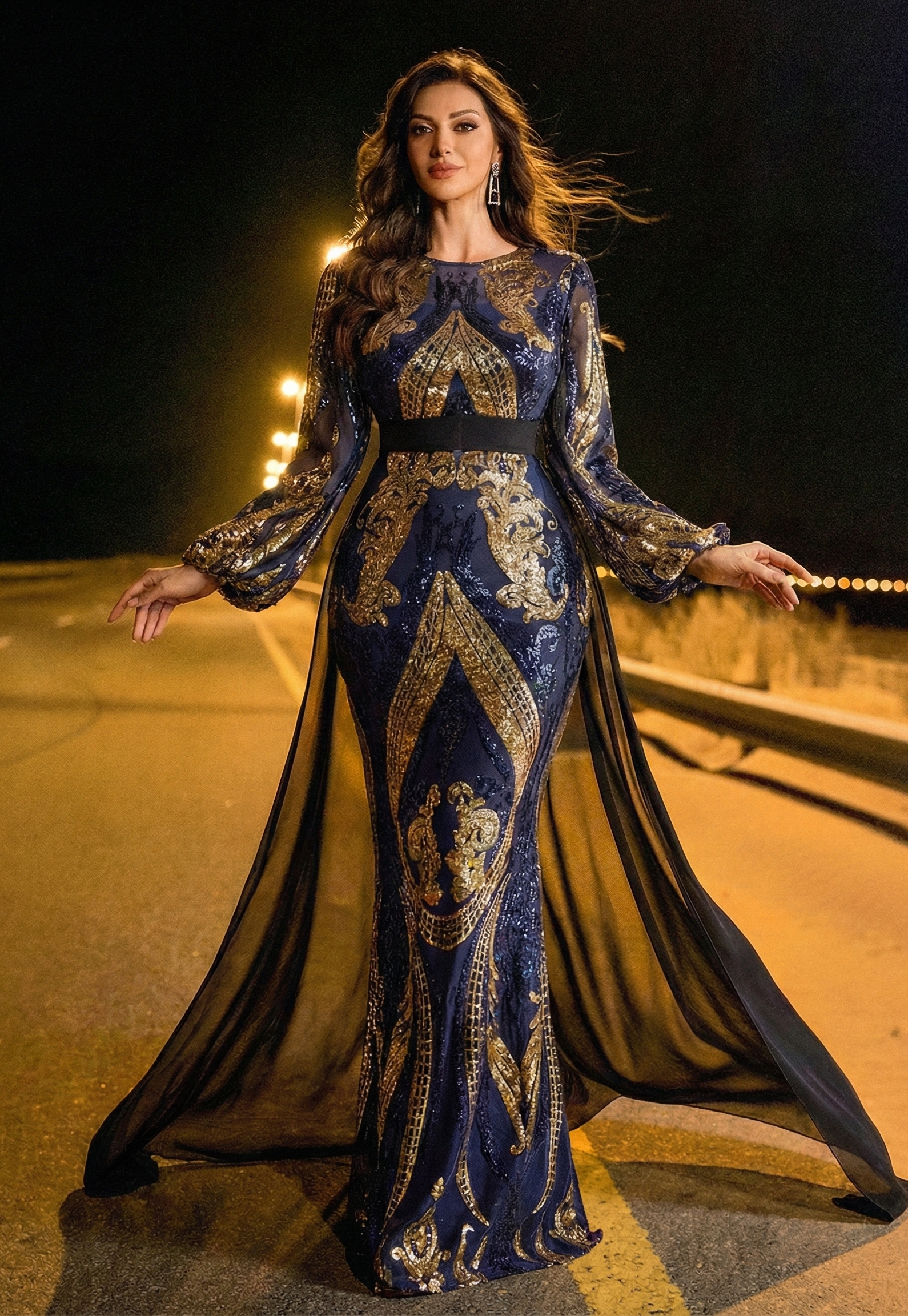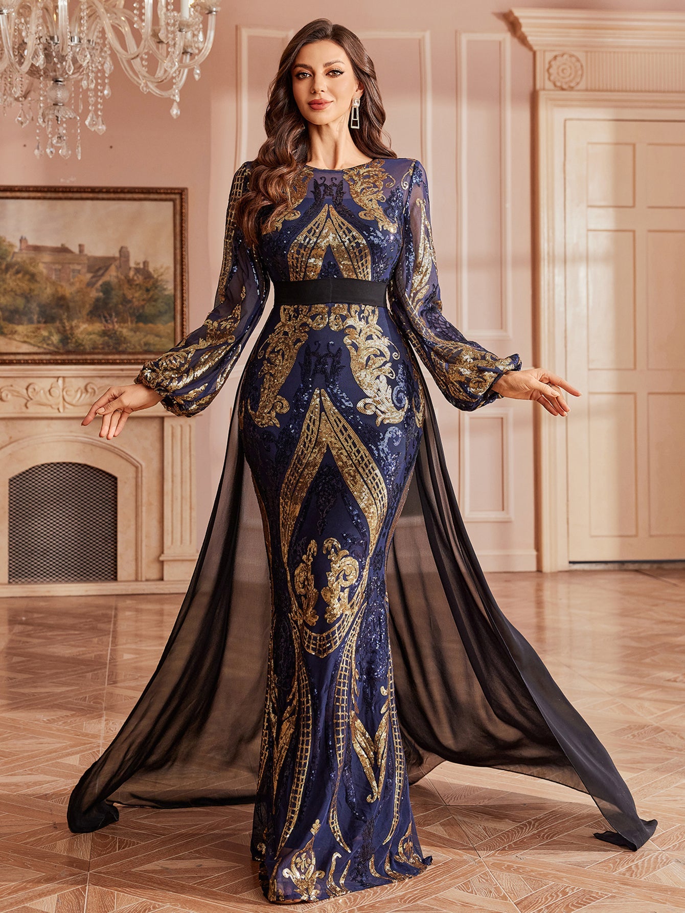 هذا الفستان الأزرق الداكن الرائع مصمم خصيصًا للمناسبات الرسمية الفخمة، ويتميز بنقوش باروكية ذهبية متقنة. يتضمن الفستان ياقة دائرية، وأكمامًا منتفخة شفافة واسعة، وحزامًا أسودًا يحدد الخصر، وعباءة شفافة انسيابية تضفي عليه أناقةً مترفة. مثالي للحفلات، والاحتفالات ذات الطابع الملكي، والمناسبات المسائية المميزة.