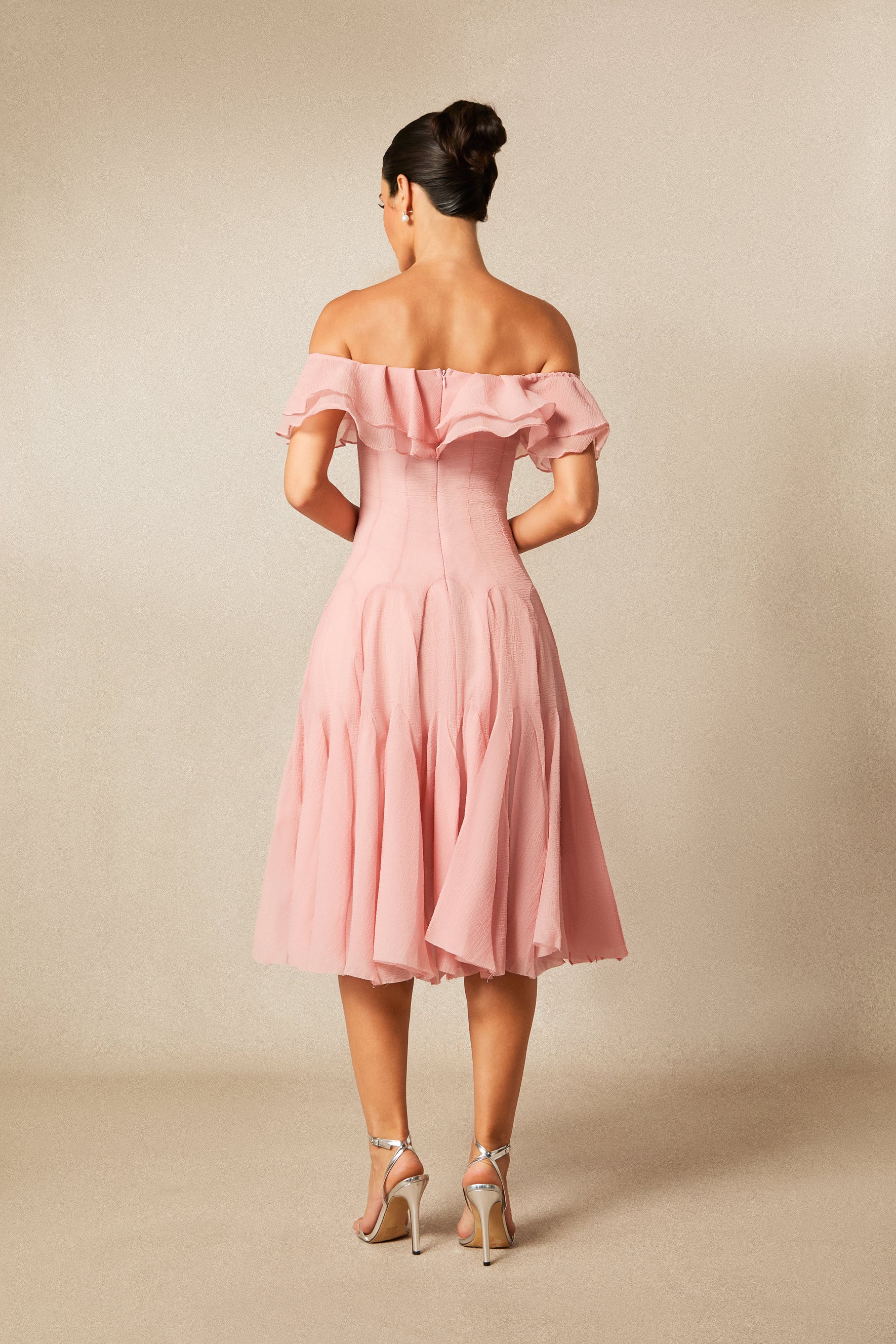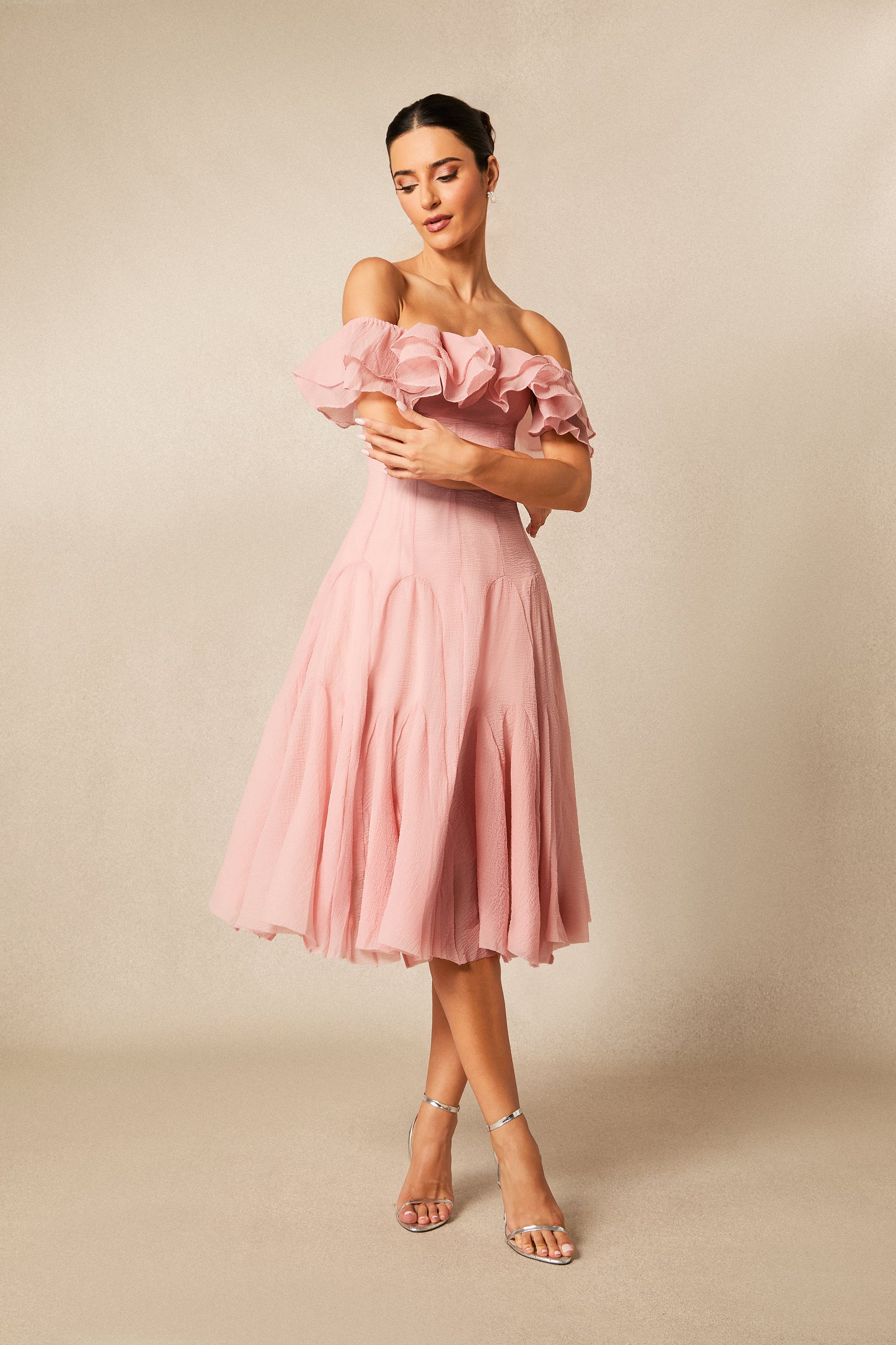 - Design: Off-shoulder neckline with ruffle trim and flounced hem for a romantic look.