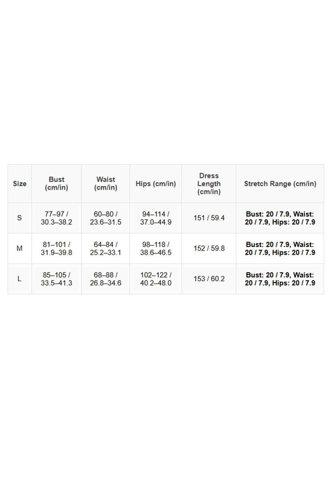 | Size | Bust (cm/in) | Waist (cm/in) | Hips (cm/in) | Dress Length (cm/in) | Stretch Range (cm/in) |