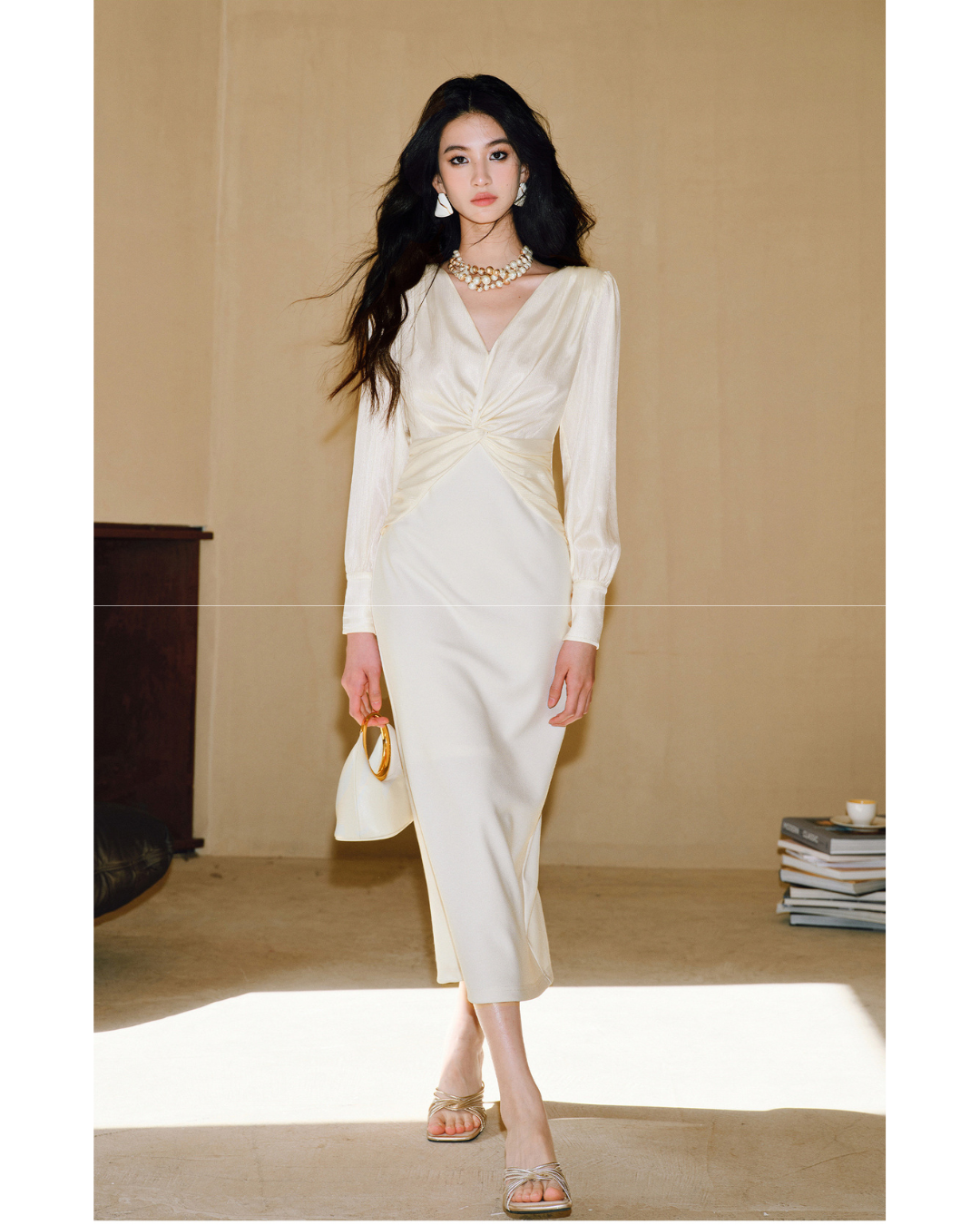 This elegant slim-fit dress features a unique V twisted collar design, perfect for both casual and formal occasions. Crafted from a luxurious blend of wrinkled shiny silk satin and stretchy linen, it offers comfort without compromising on style.