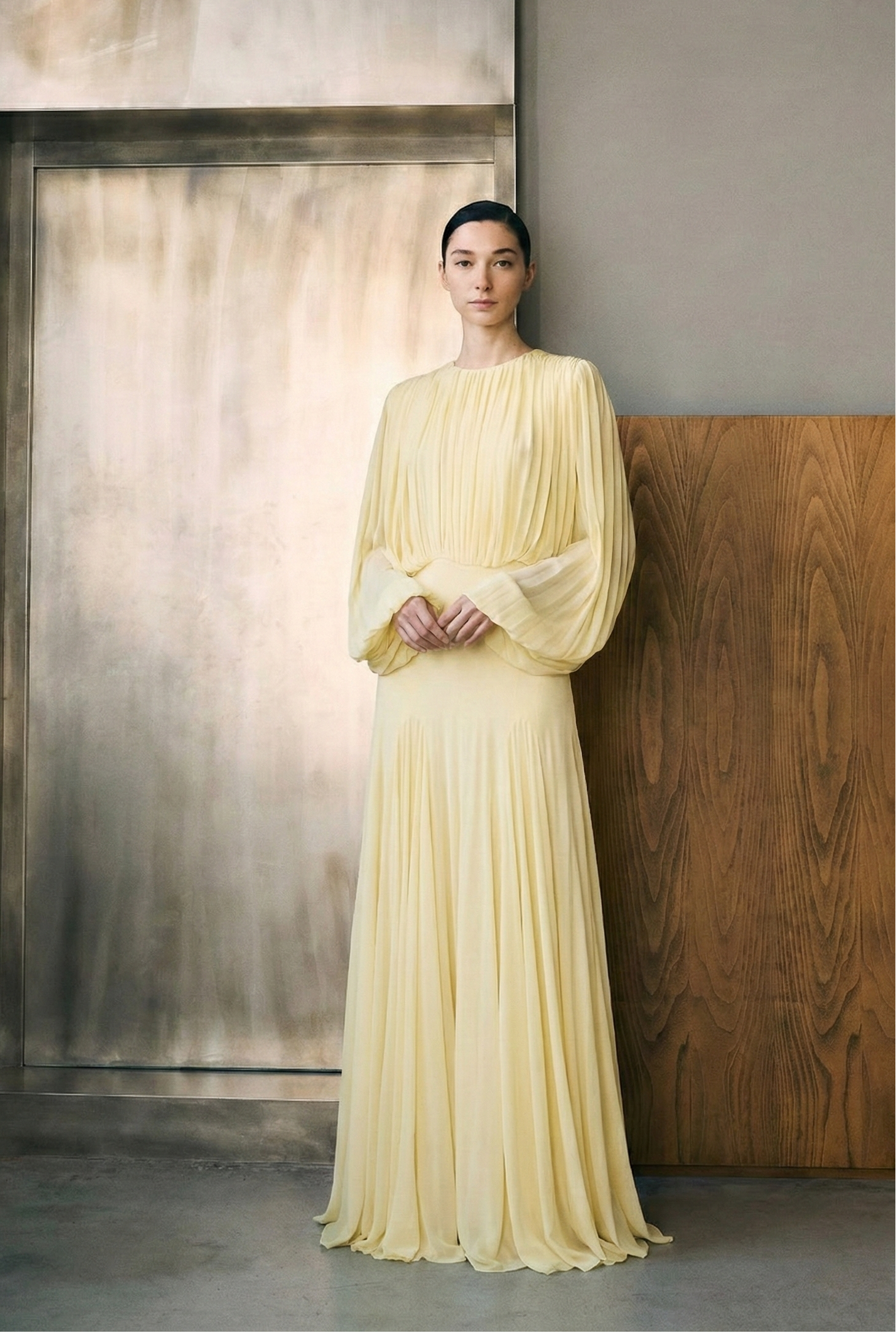 This elegant long dress features a sophisticated pleated patchwork design, perfect for formal occasions or a stylish evening out. The round-neck and waist-cinching silhouette enhance its graceful appeal, making it a versatile addition to any wardrobe.