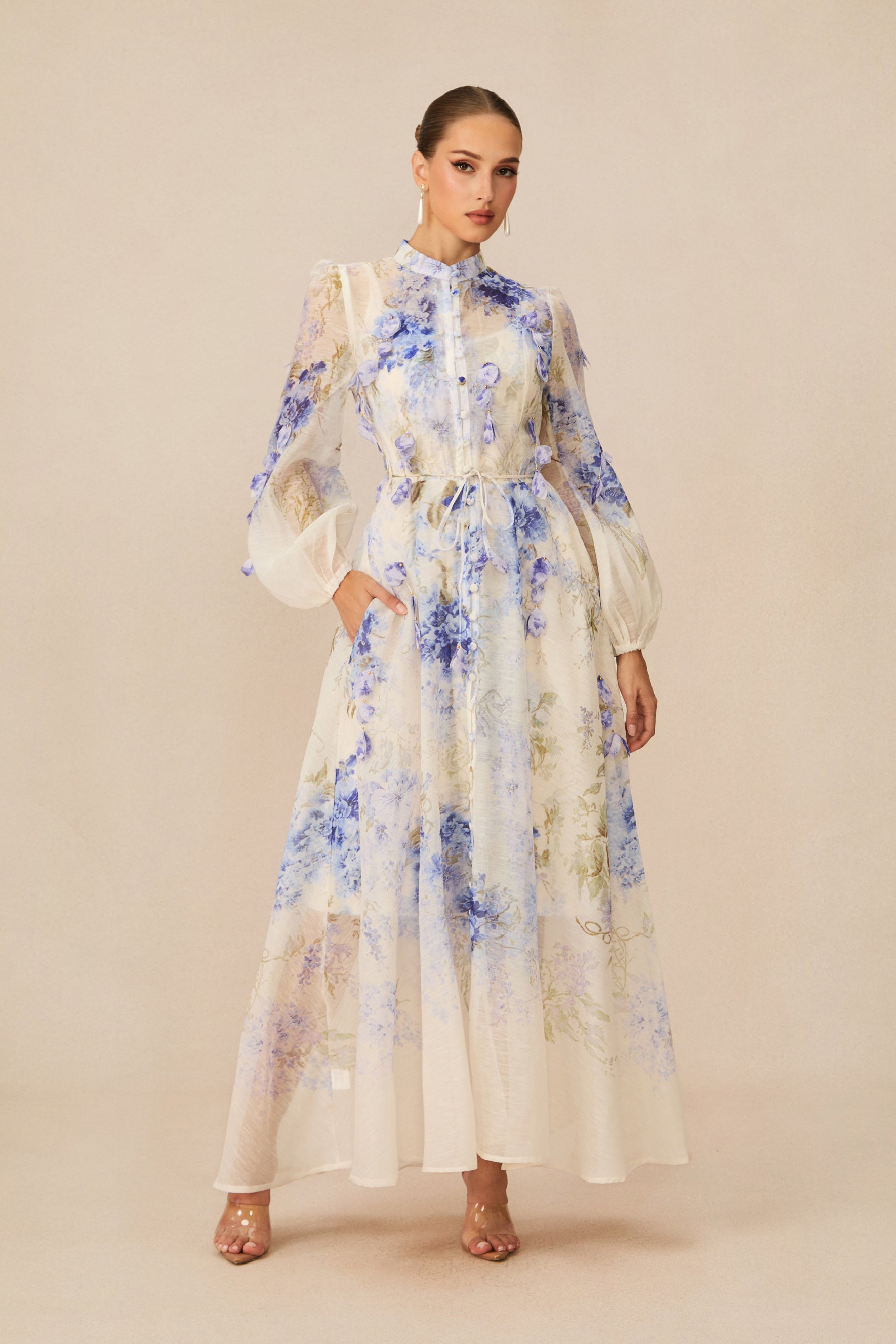 Step into elegance with this stunning blue floral maxi dress, designed to capture attention with its exquisite details and sophisticated silhouette. Perfect for any upscale event, this dress combines modern style with classic charm.
