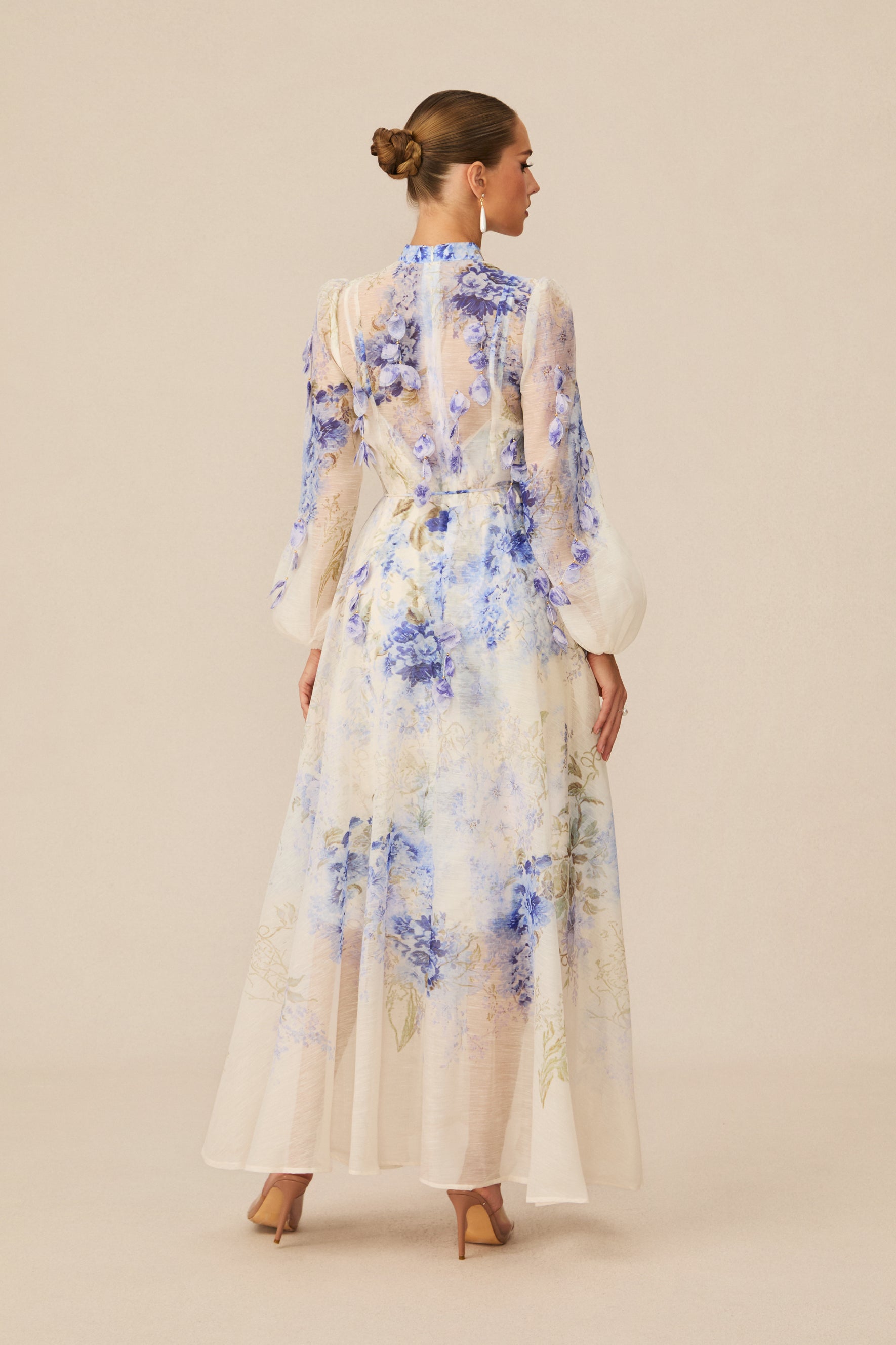 Elegant Blue Floral Maxi Dress with Balloon Sleeves