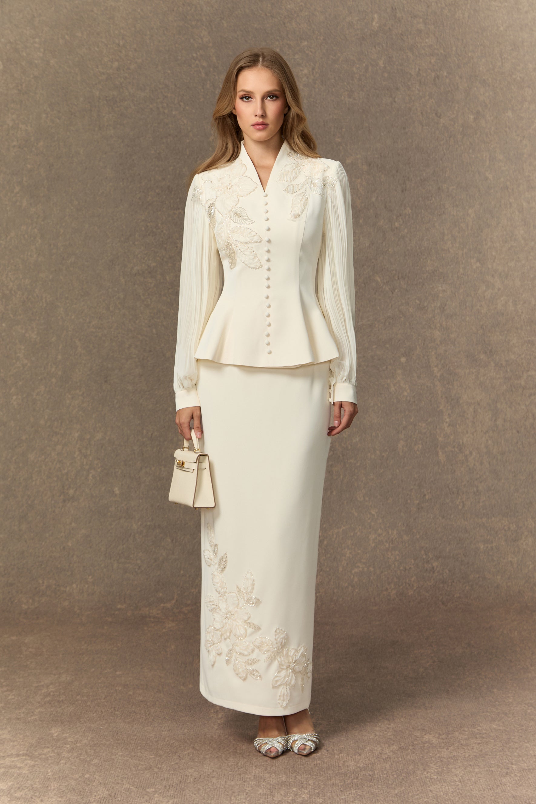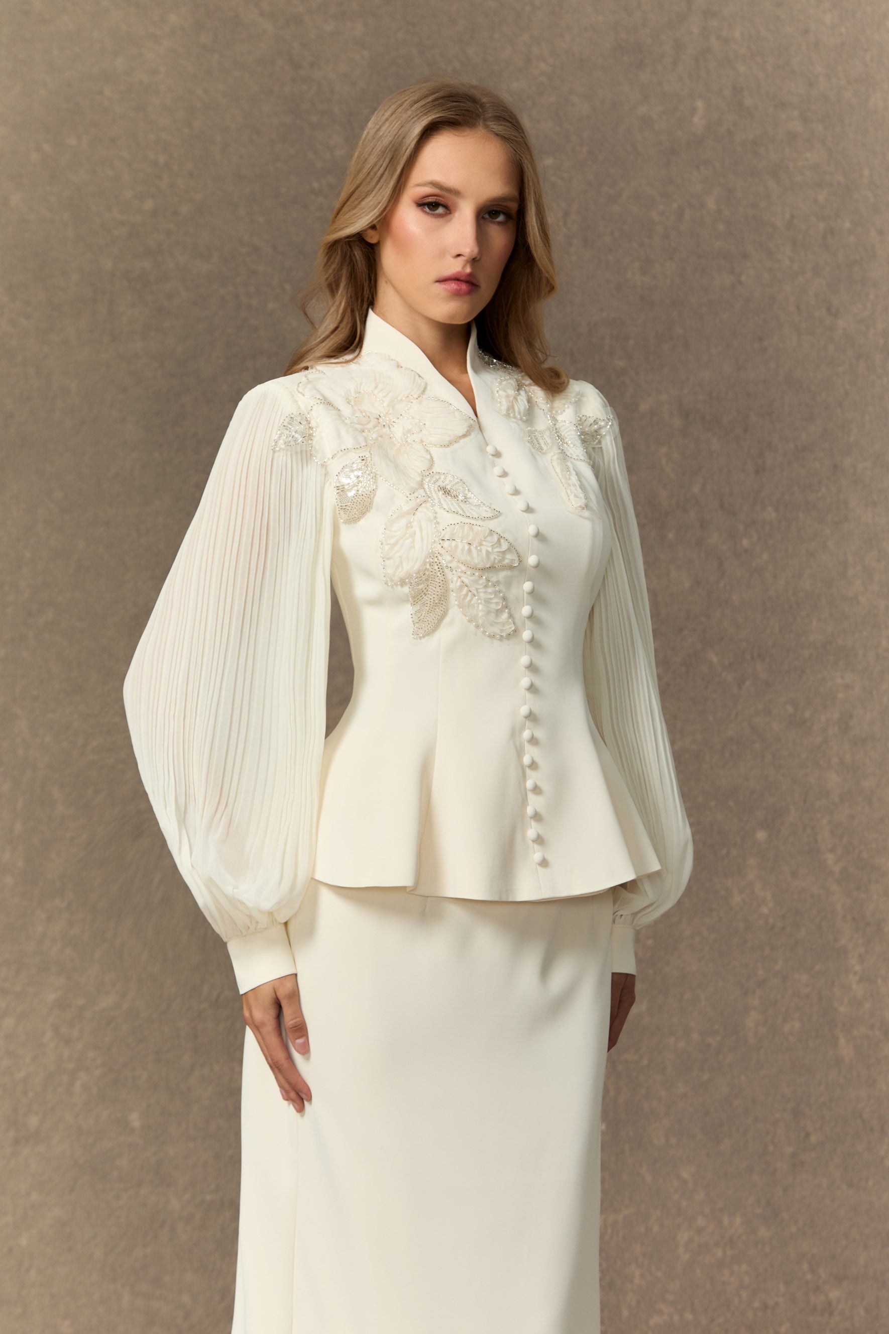 - Design: Sequin embroidered floral applique with pleated long sleeves and decorative front buttons