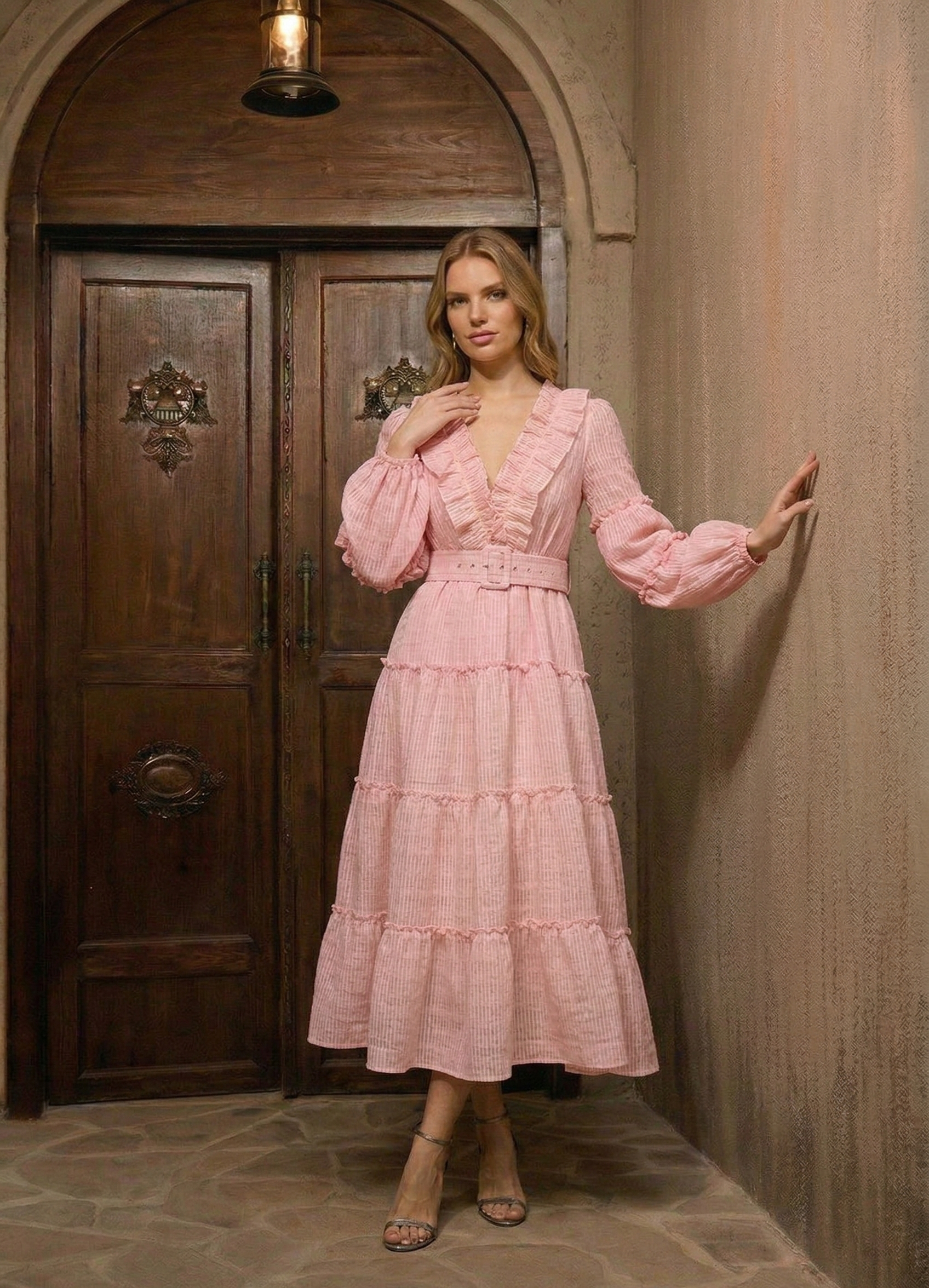 這款優雅的長裙具有修身的收腰設計和迷人的泡泡袖,非常適合秋冬場合。其精緻的風格提供顯瘦效果,是各種活動的百搭選擇。