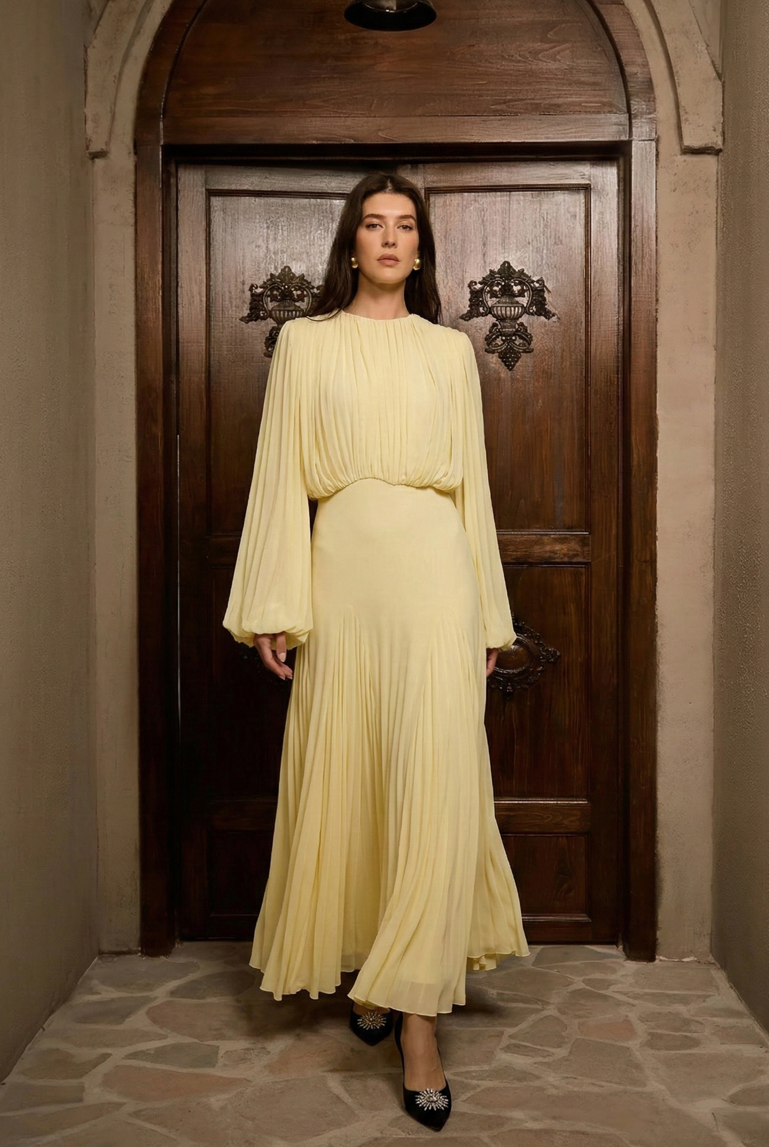 這款優雅的長裙具有精緻的拼接褶皺設計,完美適合正式場合或時尚的夜晚外出。圓領和收腰剪裁增強了其優雅的吸引力,使其成為任何衣櫥中的多功能單品。