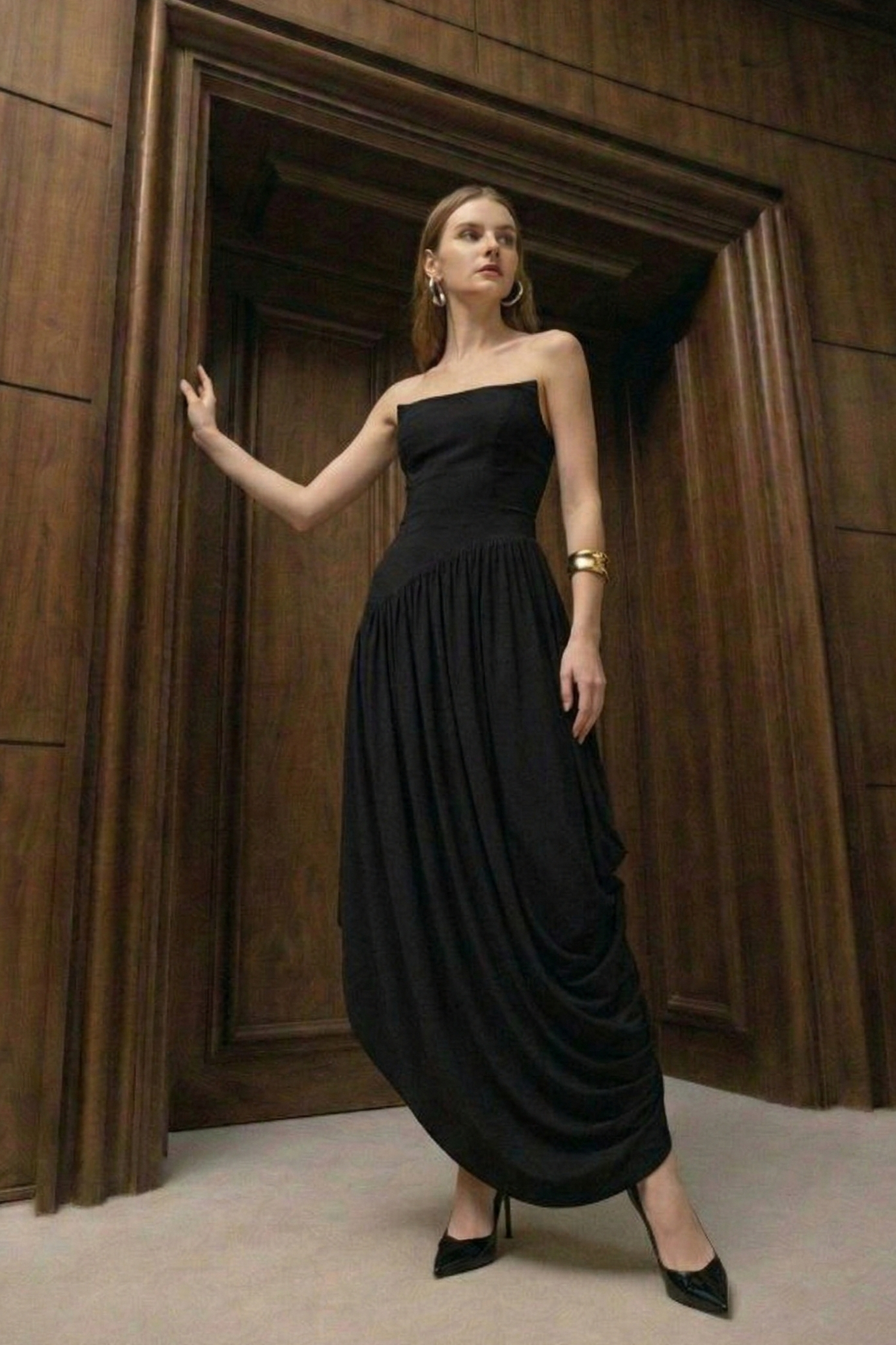 這款優雅的皺褶洋裝採用無袖無肩帶設計,搭配不規則下擺,完美展現個人風采,適合各種場合穿著。純色調增添高雅氣質,皺褶細節則強化整體輪廓感。